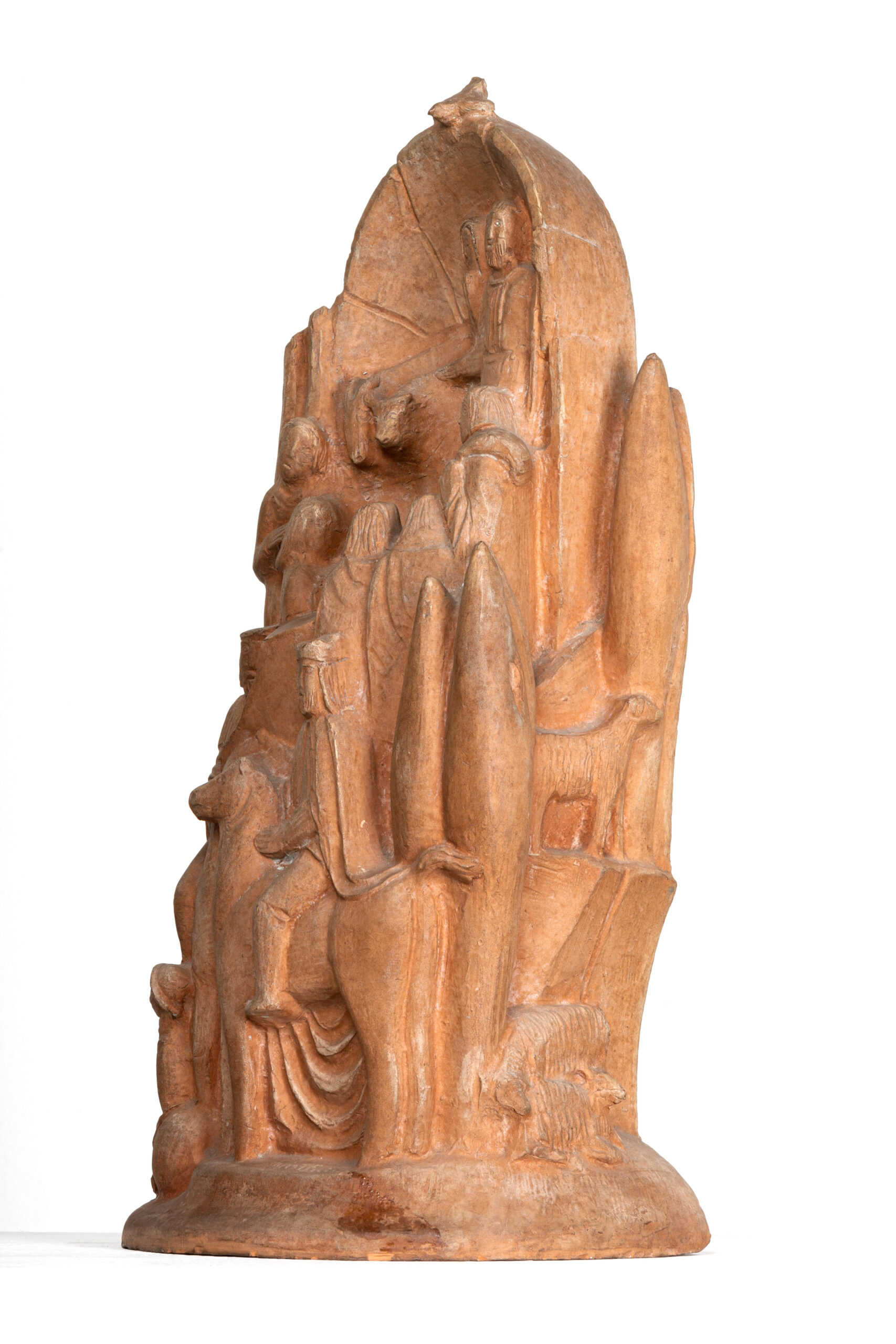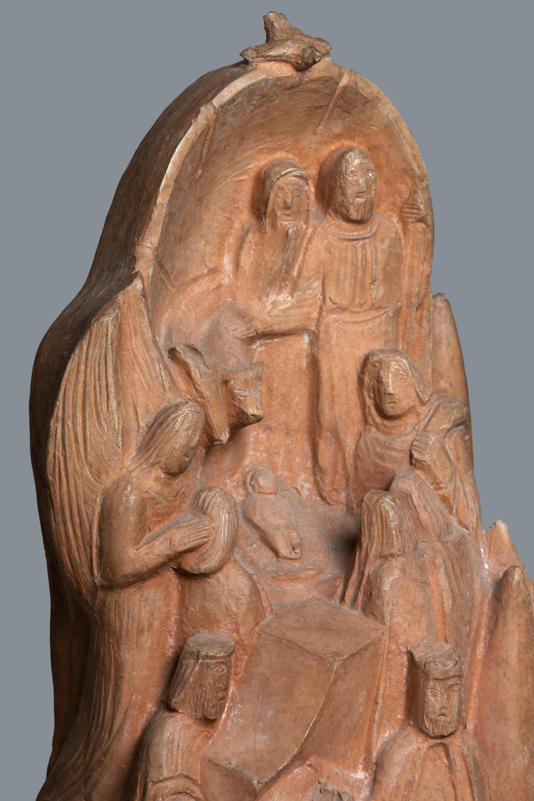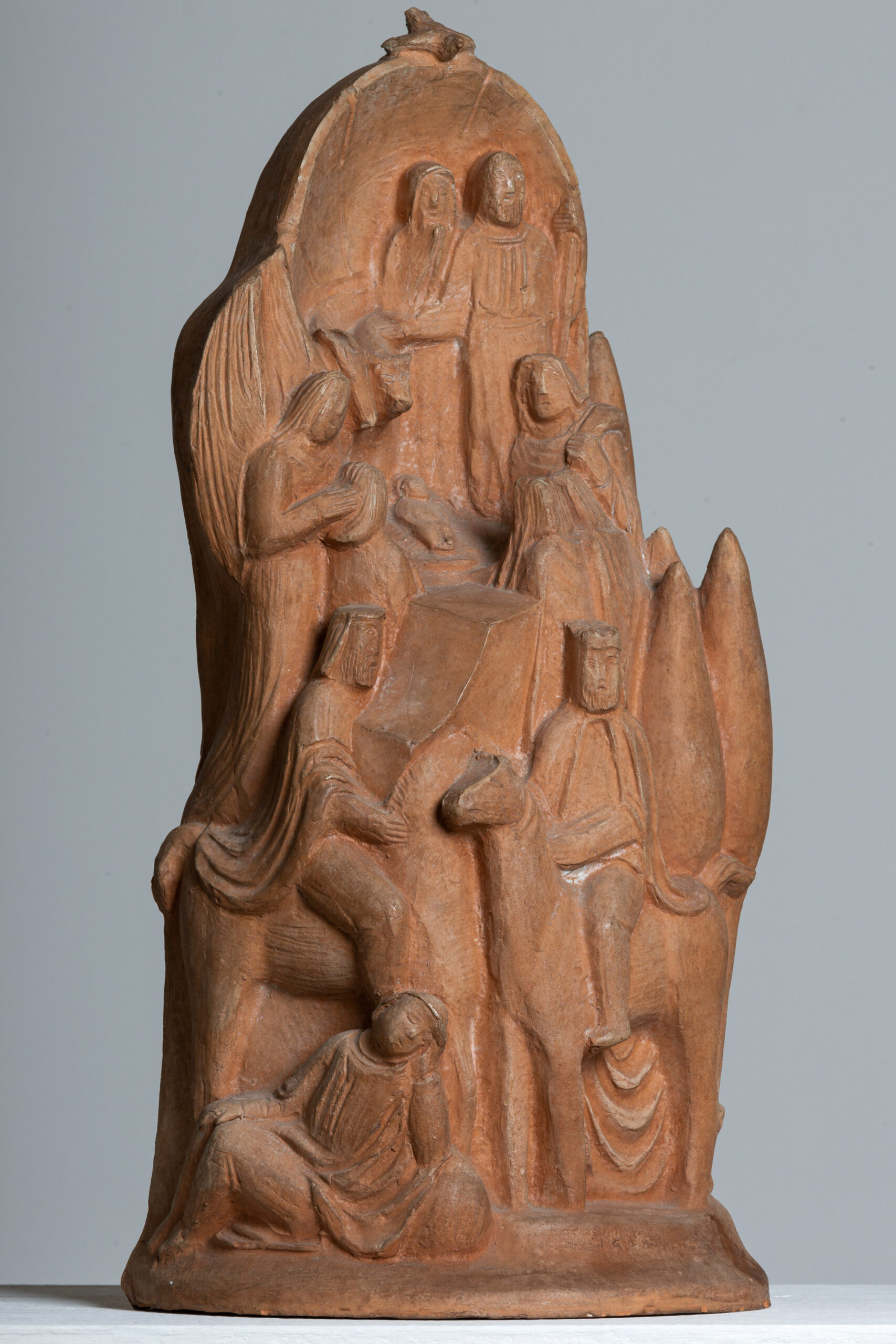 Presepe piccolo, di Arturo Martini, è una formella concava in terracotta, umile nel suo materiale grezzo e nelle sue forme “primitive”. In primo piano uno dei re Magi a cavallo. Le figure salgono, rimpicciolendo: uomini, una donna, animali, alberi, tetti di case stretti gli uni agli altri a riscaldare e proteggere il Bambino. La visione frontale è quasi imposta dal fatto che il retro della scultura è piatto e cavo. Destinato alla parete. Ma l’immagine non è piatta. Ai due lati Martini continua a modellare, con quella felicità semplice che fa scaturire le forme dalle mani come se fossero quelle di un pastaio. Ed è qui che le figure si fanno ancora più sommesse, lontane come sono dal centro, sottratte quasi al nostro sguardo.